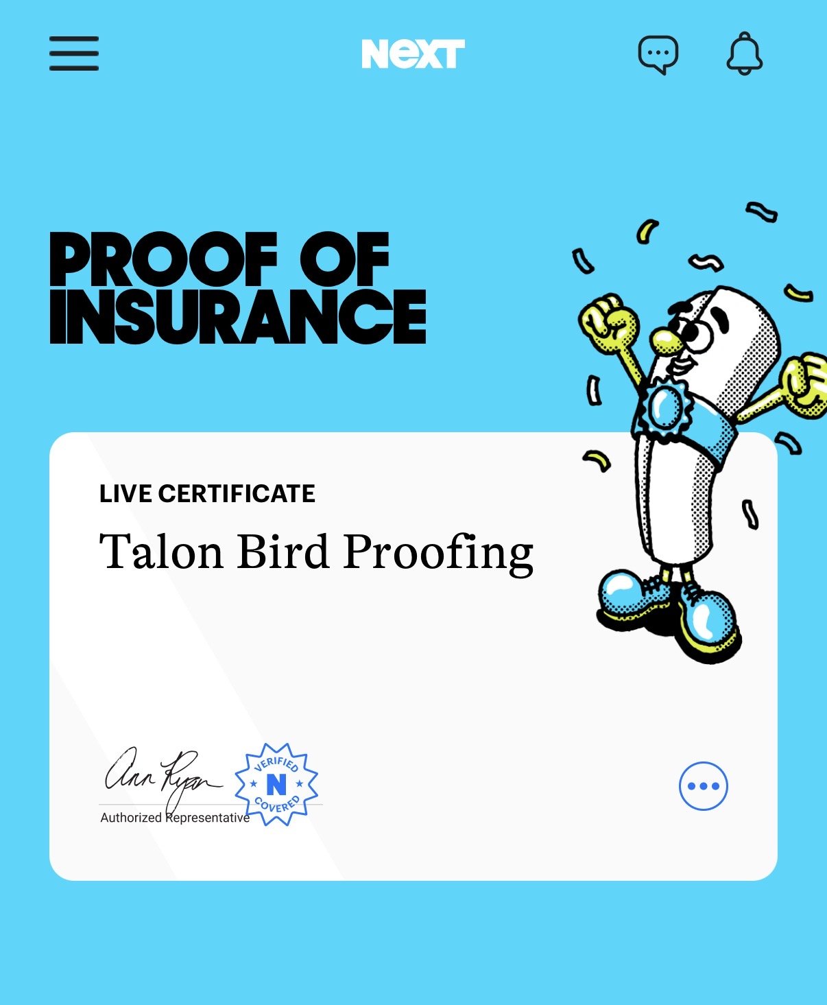 With years of industry expertise, Talon’s certified technicians use the latest tools and techniques to deliver safe, effective, and humane bird control.